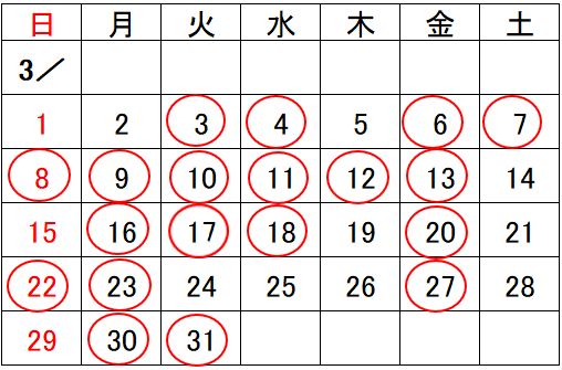 | 日 | 月 | 火 | 水 | 木 | 金 | 土 |