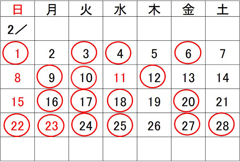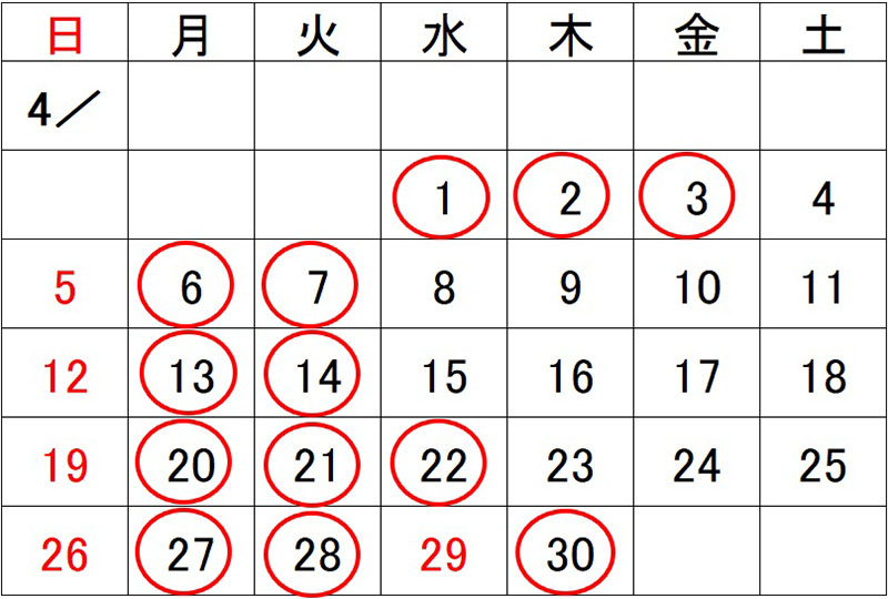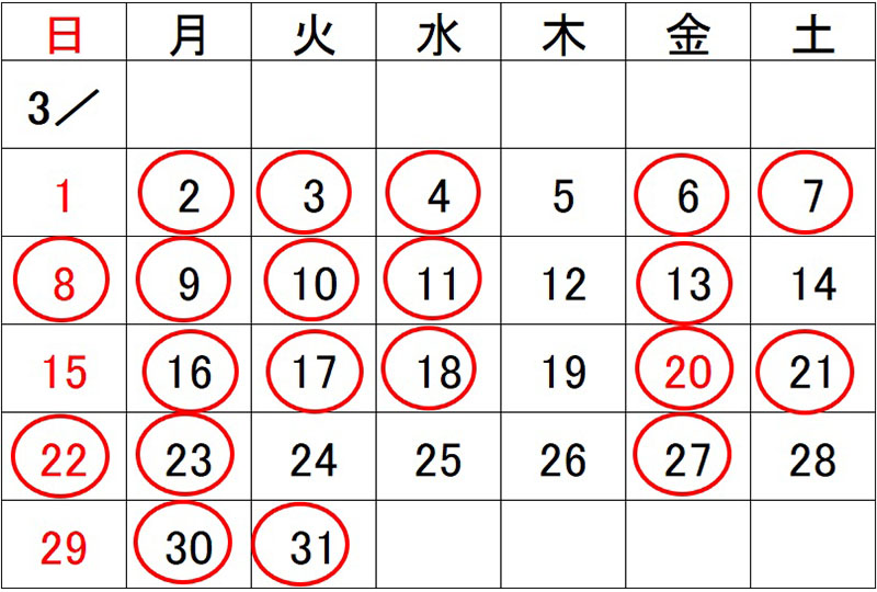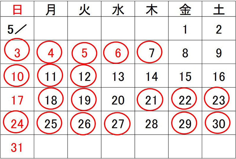 | 日 | 月 | 火 | 水 | 木 | 金 | 土 |