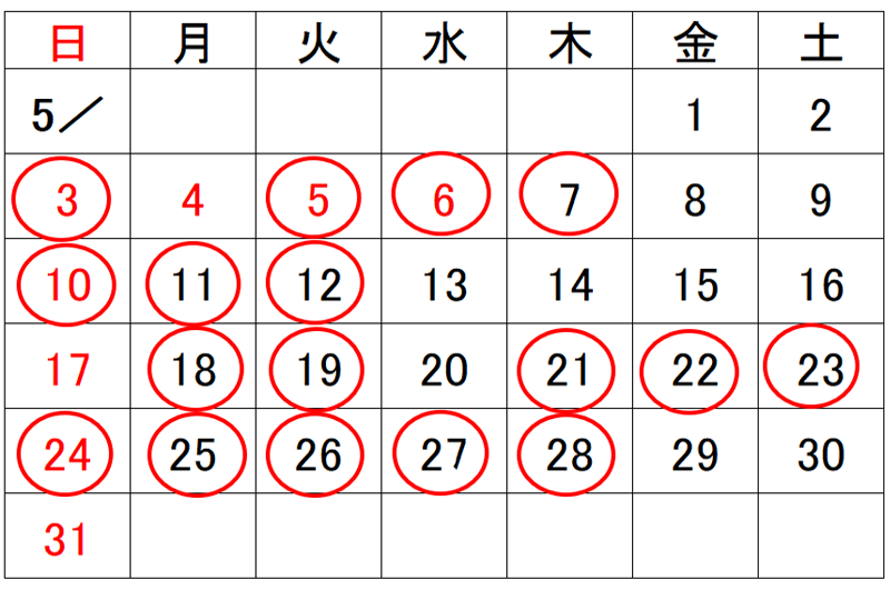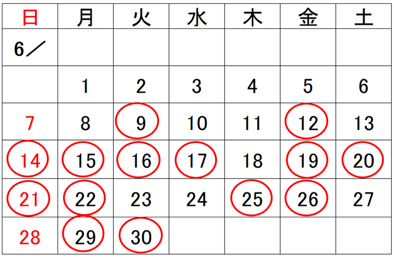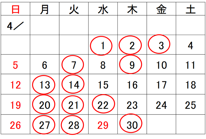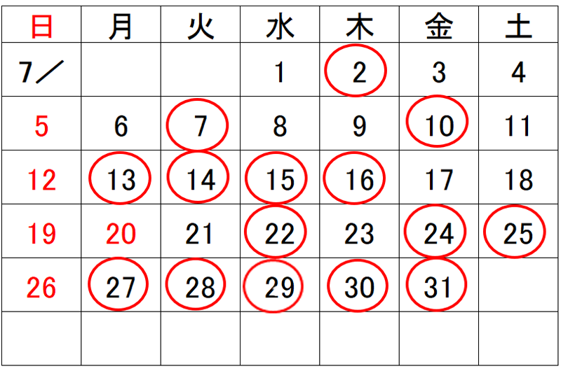 | 日 | 月 | 火 | 水 | 木 | 金 | 土 |